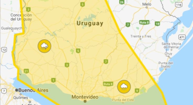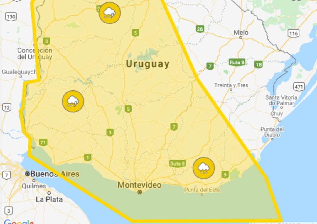 Descripción: Frente frío ingresa al país generando lluvias y tormentas, algunas puntualmente fuertes. Cabe destacar que en zonas de tormentas se podrán registrar lluvias intensas en cortos períodos, ocasional caída de granizo, intensa actividad eléctrica y rachas de viento fuertes. Se continuará monitoreando la situación y se informará ante eventuales cambios.